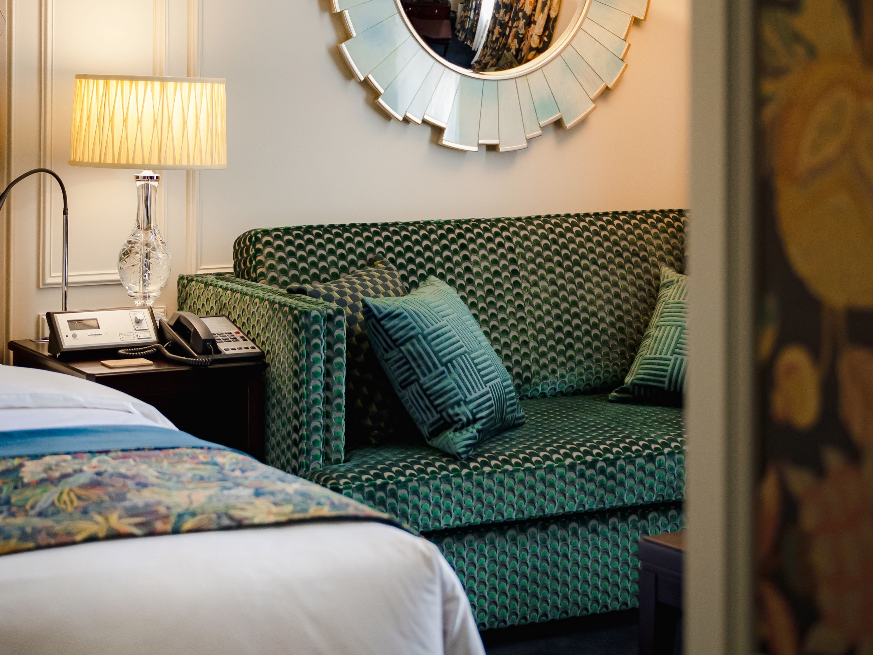 孔雀をアイコンとするHERA(ヘラ)というファブリックにちなみ、命名されたキングタイプの客室。カラースキームはピューター/オイントメント。ピューターとは、グレイッシュで、アイスグレーのような光沢感のこと。そしてオイントメントとは黄味がかっているクリーム色を指し、このスキームに導かれたひとつひとつのアイテムが、美しく調和し、甘すぎない落ちついた雰囲気となっています。ベッドにまとわせたベッドスローのHERAは、孔雀の羽毛が舞う豊かな質感を視覚で感じる上質さを備えています。つなぎ目がわからないほど美しく施工された壁紙は、まるで枯山水のような静けさをもたらします。流水線や曲線は、創業者のリバティ自身が、万博で出会った浮世絵からインスピレーションを受けたもの。全面に施された花模様が主流のヨーロッパにおいて、この余白が、日本文化を象徴しているのだとか。スタイリッシュでかつ和柄を彷彿させる曲線が、客室の壁のデザインとシンクロしています。