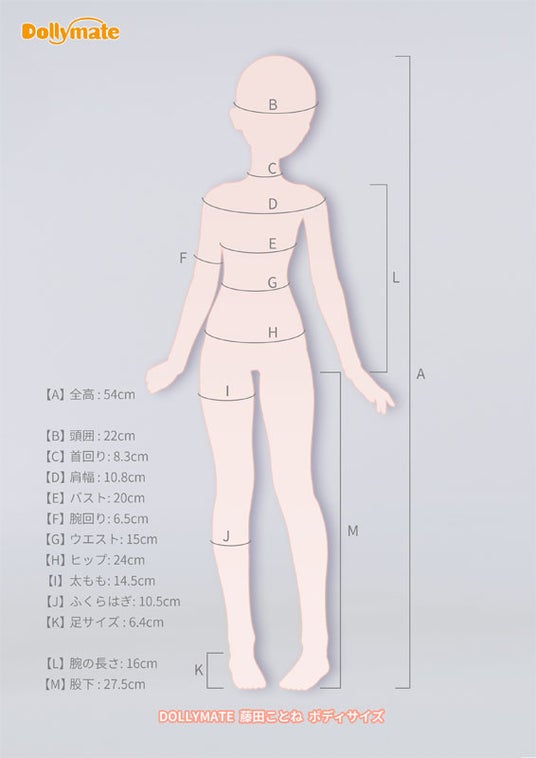 【サイズ】身長540mm(ヘッド含む)、ボディ(全高:54cm/頭囲:22cm/首周り:8.3cm/肩幅:10.8cm/バスト:20cm/腕周り:6.5cm/ウエスト:15cm/ヒップ:24cm/太もも:14.5cm/ふくらはぎ:10.5cm/足サイズ:6.4cm/腕の長さ:16cm/股下:27.5cm)
