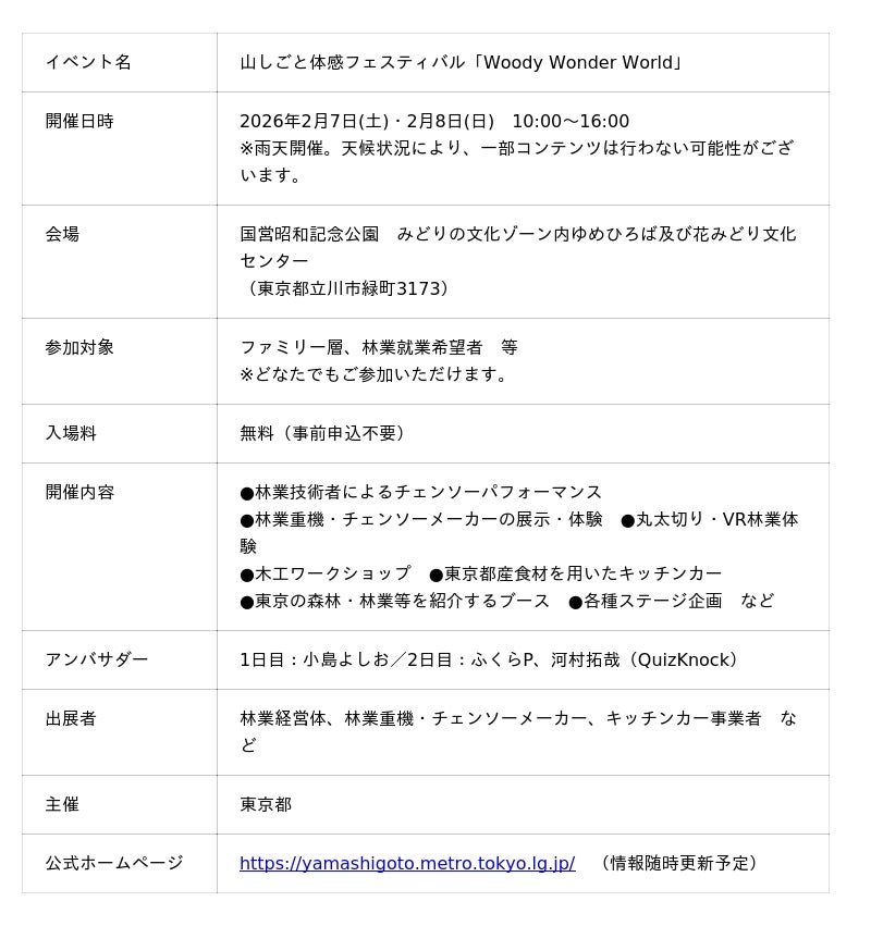 東京都は、森林・林業の役割や重要性の普及啓発を促進するとともに、森林を守り育てる林業技術者の認知度向上を図るため、森林・林業や森のめぐみを五感で感じることのできる体験型イベント山しごと体感フェスティバル「Woody Wonder World」を2月7日(土)、8日(日)の2日間、国営昭和記念公園にて新たに開催します。
