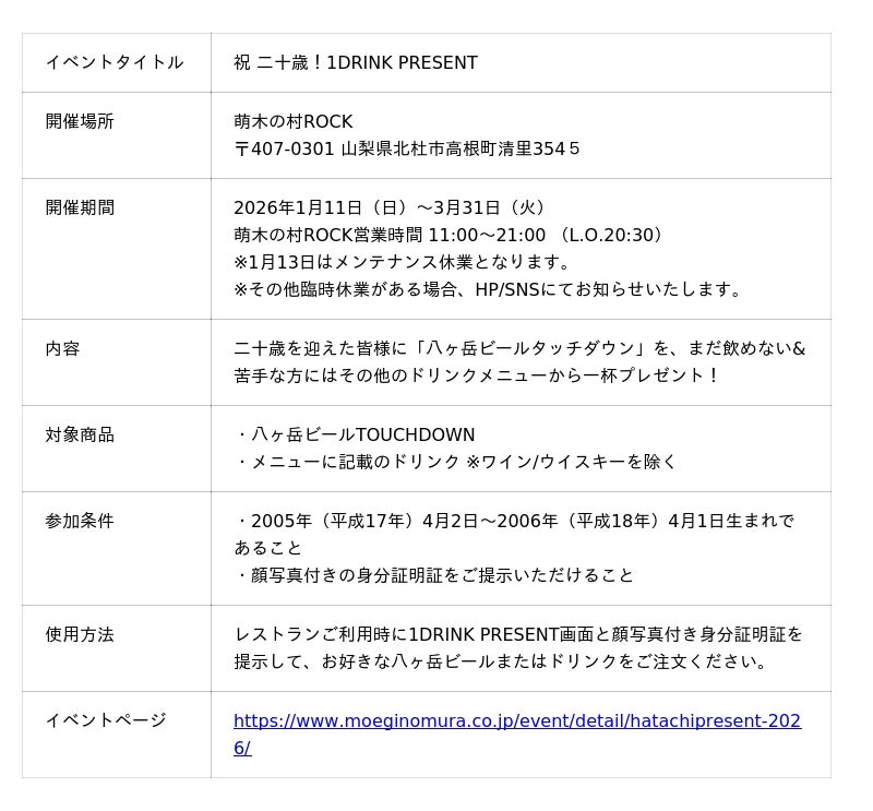 萌木の村株式会社(代表取締役社長舩木上次、山梨県北杜市高根町清里3545)は1月12日(月・祝)の「成人の日」に合わせ、2025年度に二十歳を迎えた方に村内のレストラン「萌木の村ROCK」で、自社醸造クラフトビール「八ヶ岳ビールタッチダウン」などを1杯プレゼントするキャンペーンを初実施します。