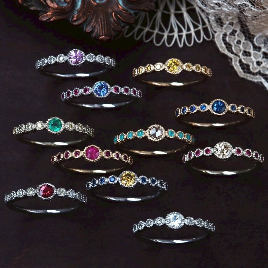 センターストーンには7~8mmサイズの宝石を配し、周囲を囲む取り巻き石の組み合わせによって、一点一点異なる表情を持たせております。宝石の存在感を明確に引き出す構造により、指元に量感と華やぎをもたらすリングです。