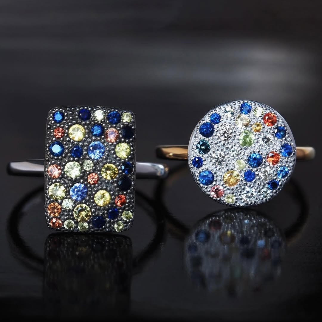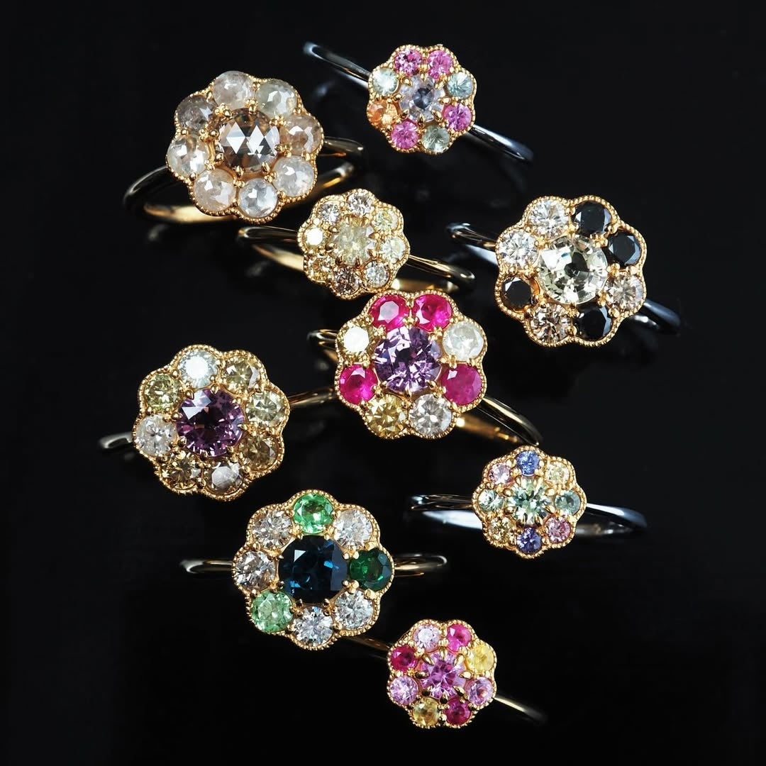 ひとつは、ランダムな構成を特徴とする"新型"の「ミルシェノン」。PARCELLE JEWELRYのメインデザイナー・成澤泰介(@taisuke_parcelle)が買い付けたルビーやサファイアの中から、透明感の際立つ石を選び、配色を重ねました。
