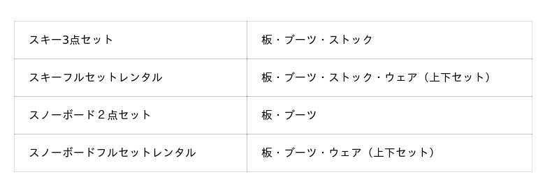 お客様は、スキー用品とウェアのセット「スキーフルセットレンタル」「スノーボードフルセットレンタル」またはスキー用品のセット「スキー3点セット」「スノーボード2点セット」の4種類から、ニーズに合わせて選択することができます。