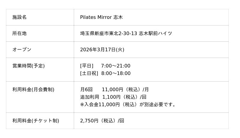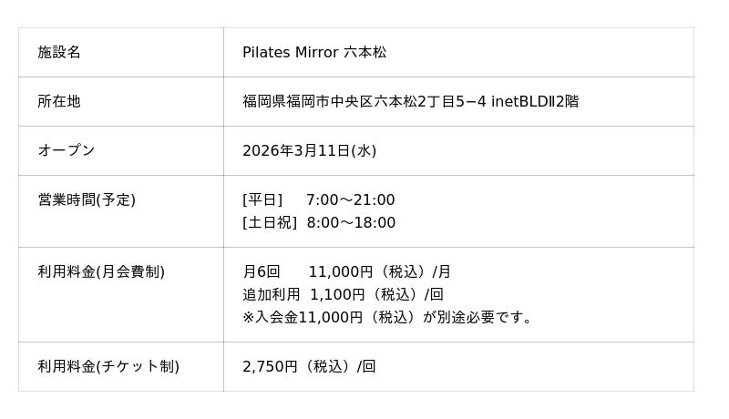コナミスポーツ株式会社(以下、「弊社」)は、天井にミラーを設置したマシンピラティススタジオ「Pilates Mirror 六本松(福岡県福岡市)」を2026年3月11日(水)に、「Pilates Mirror 志木(埼玉県新座市)」を2026年3月17日(火)にオープンします。