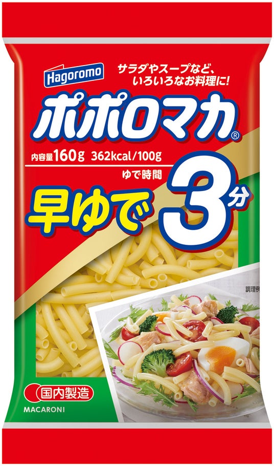 『ポポロマカ』は、デュラム小麦のセモリナ100%の本格派マカロニです。サラダ、グラタン、スープなど幅広いメニューに手軽にお使いいただけます。マカロニ市場は、ゆで時間3分以下の「早ゆで」タイプが主流です。「ポポロマカ早ゆで3分」は、よりプリッとした食感でお召し上がりいただけるベストなゆで時間を探求し、ゆで時間を3分にしました。内容量も100g・160g・300gの3種類で展開し、お客様の使用用途によって使い分けいただけるような製品ラインアップを用意しました。パッケージにはゆで時間がひと目でわかるように、大きな文字で「早ゆで3分」と記載しました。