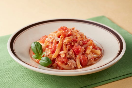 トマトをたっぷり使用した温かいマカロニメニューです。シーチキンがアクセントになっています。