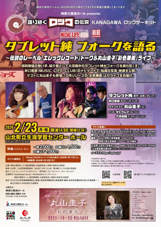 建て替えに伴い2025年4月より休館中の神奈川県民ホールは今年度、ロック・レジェンドが気心知れた仲間とのジャム・セッションをしたり、レコードや楽器を持ち寄ってロックの魅力を語り合うイベント「語り継ぐロックの伝説」とコラボレーション。神奈川県下で「KANAGAWA ロックサーキット」シリーズを開催しています。歌謡漫談&物まね芸人として大活躍中のタブレット純。日本一昭和歌謡を愛する男として、オールドメディアからニューメディアまであらゆる媒体に登場、特にラジオでは多数のレギュラー番組に出演。「週刊新潮」「神奈川新聞」の連載でもおなじみの彼が、シンコーミュージック【MUSIC LIFE CLUB】メディアプロモーション担当で元「BACK STAGE PASS」編集長の井口吾郎を迎え、1970年代にフォーク音楽の大ブームを巻き起こした伝説のインディーズレーベル「エレックレコード」の魅力を大解剖するスペシャル・イベント第2弾!