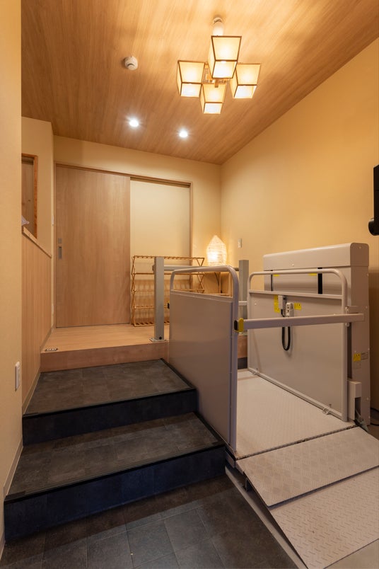 「京都市の厳しい景観条例・バリアフリー条例」と「既存の戸建て建築」の両立は至難の業とされてきました。当館では、玄関に電動の段差解消機を設置することでこの課題を解決。車椅子をご利用の高齢者の方も快適に入館可能です。
