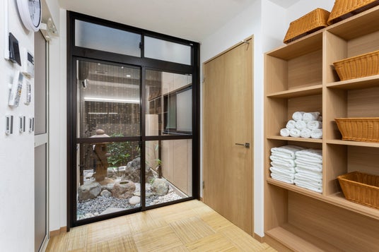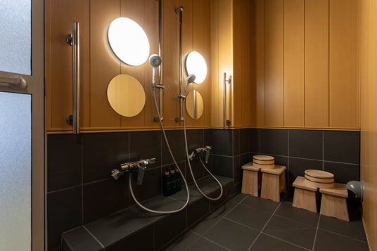 本施設は、京都市の厳しいバリアフリー条例をクリアするため、戸建て宿泊施設としては極めて珍しい、玄関に「電動段差解消機」を導入。さらに、「7人入れる巨大浴槽+信楽焼壺風呂+サウナ」のミニ銭湯設備や、「二条城を望む業務用カラオケ付き防音和室」を完備。