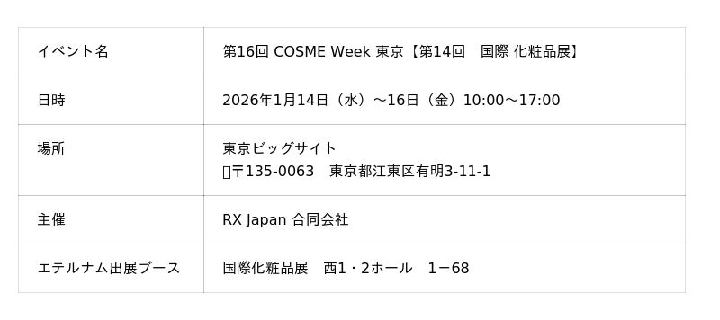 『永遠の美しさへの夢が、夢に終わらない未来を創りあげること』を使命に掲げる、化粧品の研究開発・製造販売を行う株式会社エテルナム(本社:東京都渋谷区、代表取締役:松本隆明)は、2026年1月14日(水)~16日(金)に東京ビッグサイト(東京都江東区)にて開催される第16回 COSME Week 東京【第14回 国際 化粧品展】に出展します。