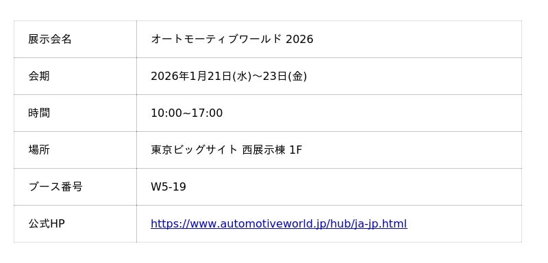 コーンズテクノロジー株式会社(本社:東京都港区、代表取締役社長:西岡和彦)は、2026年1月21日(水)~23日(金)に東京ビッグサイトにて開催の『オートモーティブワールド 2026』に出展いたします。