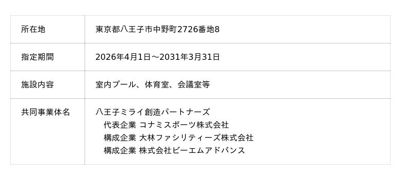 コナミスポーツ株式会社(以下「弊社」)は、弊社が代表企業として参画する共同事業体が、結城市(茨城県)、八王子市(東京都)、兵庫県、東広島市(広島県)、福岡市(福岡県)から、各県・市内の施設の運営を担う指定管理者として新たに指定されたことをお知らせします。