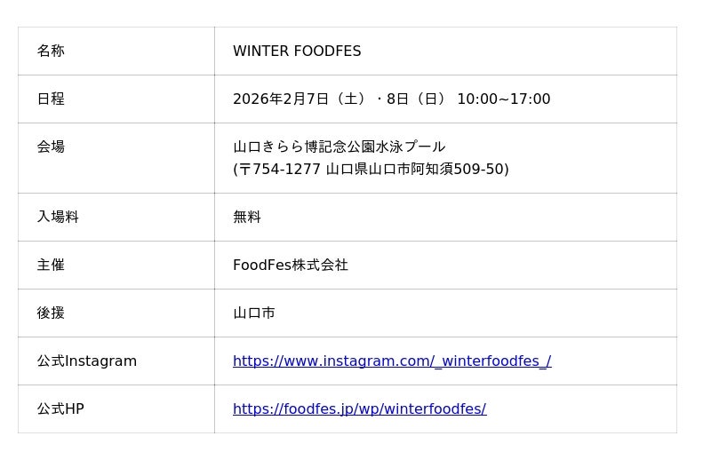 FoodFes株式会社(代表取締役:稲垣一馬)は、2026年2月7日(土)・8日(日)の2日間、山口きらら博記念公園水泳プール入り口(山口県山口市)にて「WINTER FOODFES」を開催いたします。