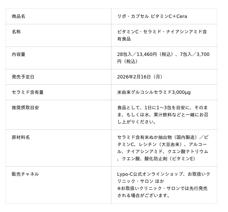 「未来の健康を、つくる。」を掲げる株式会社スピック(本社:神奈川県鎌倉市、代表取締役社長:芝田崇行)は、インナーケアブランド「Lypo-C」から、セラミド×ビタミンC×ナイアシンアミドを1包で摂取できる新製品「Lypo-C Vitamin C+Cera(リポ・カプセル ビタミン シー プラス セラ)」を2026年2月16日(月)に発売いたします。