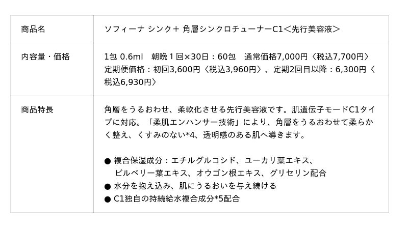 『ソフィーナ シンク+ 角層シンクロチューナーC1』は肌遺伝子モードC1タイプに対応。「柔肌エンハンサー技術」により、角層をうるおわせて柔らかく整え、くすみのない*4透明感のある肌へ導きます。