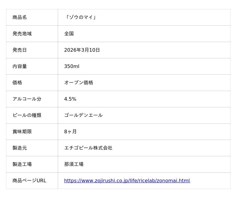 本商品は、「全国第一号クラフトビール(地ビール)」の醸造所として知られるエチゴビール株式会社(本社:新潟県新潟市、代表者:阿部誠)が製造し、3月10日より、象印マホービングループの販売会社である象印フレスコ株式会社が販売いたします。