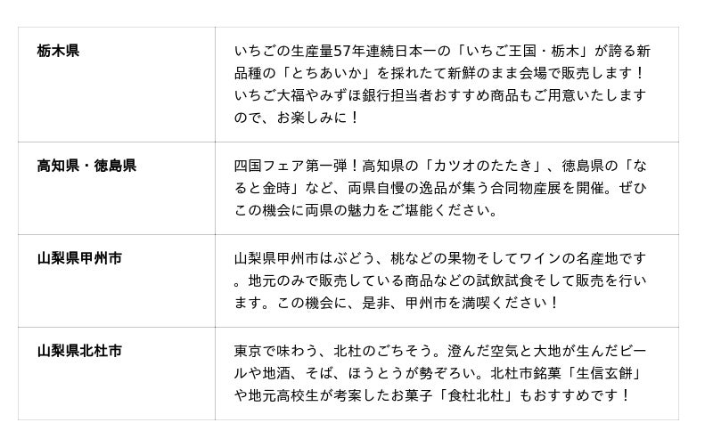 ・ 1月は19日~23日の期間に、栃木県・高知県・徳島県・山梨県(甲州市・北杜市)の名産品が集結