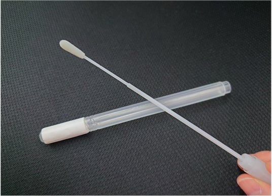 3. ご自身で採取:綿棒で口の中をこすって検体を採取します。