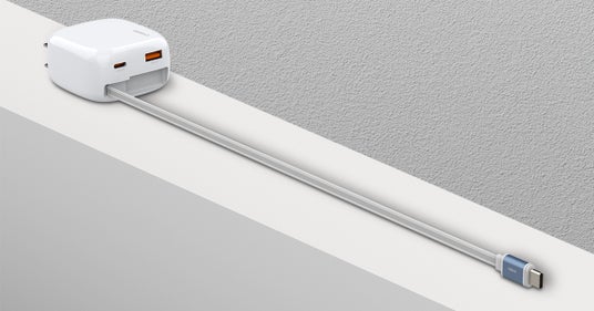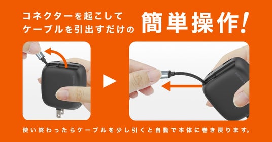 USB-C巻取ケーブルを充電器本体に内蔵していますので、この充電器一つあれば、コンセントに差し込むだけで、USB-C端子搭載機器の充電が可能になる便利な充電器です。
