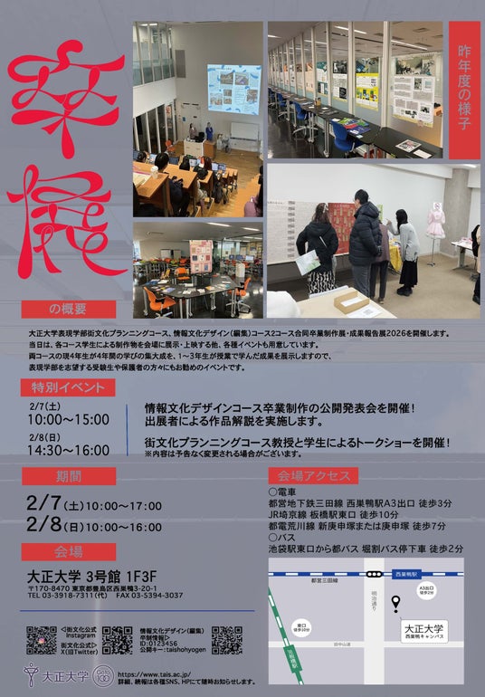 大正大学(学長:神達知純、所在地:東京都豊島区)表現学部の街文化プランニングコース、情報文化デサインコースの2コースは、2月7日(土)および8日(日)に本学施設にて、「合同卒業制作展・成果報告展2026」を開催します。