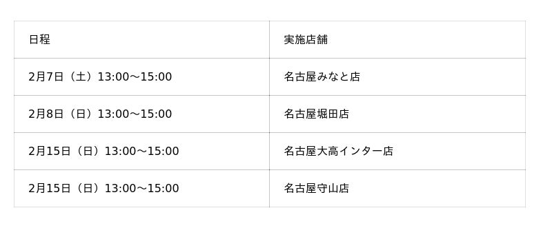 実施店舗:名古屋みなと店、名古屋堀田店、名古屋大高インター店、名古屋守山店、名古屋当知店