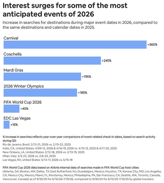 - 最も検索されている2026年の旅行日程と都市の65%は、冬季オリンピックやコーチェラ、FIFAワールドカップといった世界的なイベントと重なっており、イベントを目的とした旅行が人気です。日本でもF1日本グランプリや雪まつりなどイベント連動型の旅行に注目が集まっています。