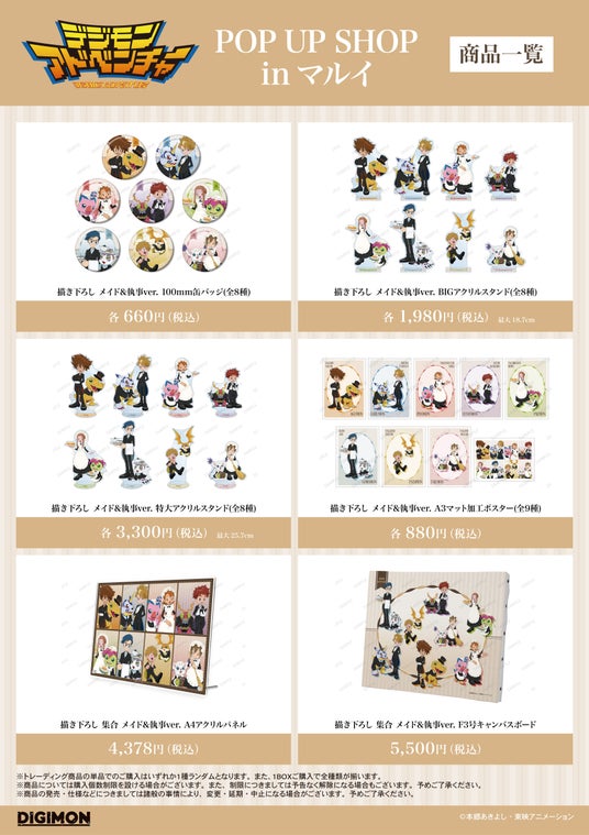 今回のイベントでは『デジモンアドベンチャー』より「メイド&執事」をコンセプトにした新規描き下ろしイラストを使用した新規グッズを多数先行販売する他、イベント購入特典の配布やスタンディパネルの展示を予定しております。