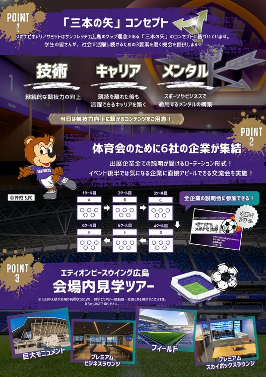 当社とサンフレッチェ広島は「スポーツが持つ価値の最大化」という共通の信念のもと、強固なパートナーシップを構築いたしました 。 本イベントでは、サンフレッチェ広島の「三本の矢」をベースとした「技術・キャリア・メンタル」という3つのテーマを掲げ、体育会人財の支援と地域企業の採用促進を通じて、広島の経済およびスポーツ文化のさらなる発展に貢献することを目指してまいります。