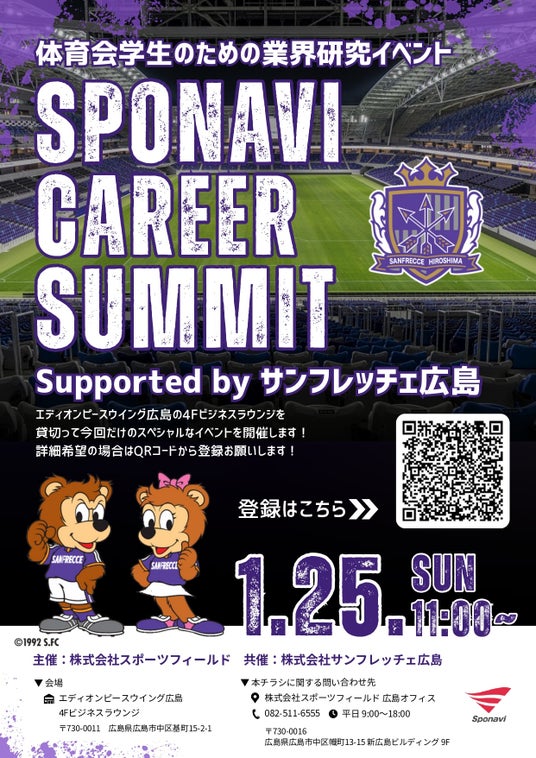 株式会社スポーツフィールド(本社:東京都新宿区 代表取締役:篠崎克志)は、広島県を本拠地とするプロサッカーチーム「サンフレッチェ広島」を運営する株式会社サンフレッチェ広島(本社:広島県広島市 代表取締役:久保雅義)との特別共催により、体育会学生・アスリート向け就職イベント「スポナビキャリアサミット Supported by サンフレッチェ広島」を2026年1月25日(日)にエディオンピースウイング広島にて開催いたします。
