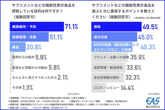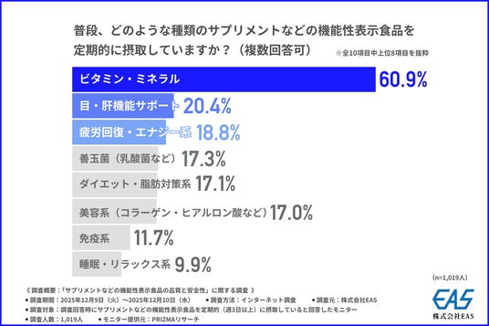 株式会社EAS(本社所在地:神奈川県横浜市、代表取締役:二分 茂礼)は、サプリメントなどの機能性表示食品を定期的(週3日以上)に摂取している方を対象に、「サプリメントなどの機能性表示食品の品質と安全性」に関する調査を行いました。