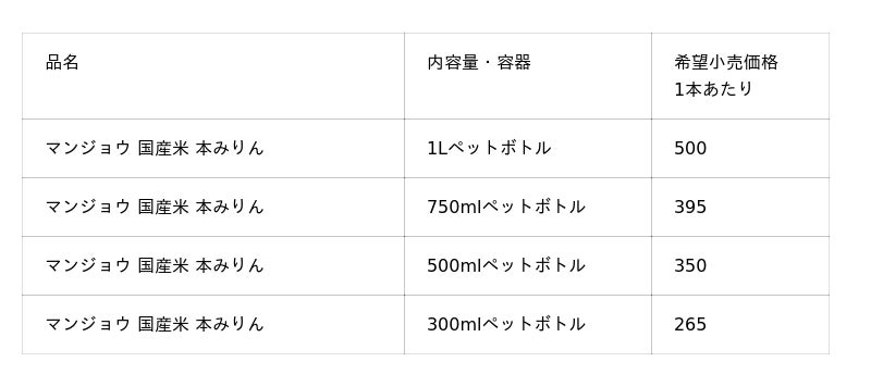 1.品名及び内容量・容器、価格 (単位:円 消費税別)