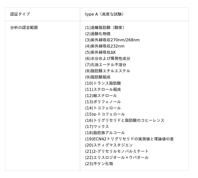 ※ 認証名称は、2024年までは「オリーブオイル理化学分析ラボtype B認証」、2025年から「オリーブオイル理化学分析ラボtype A認証」に変更されています。