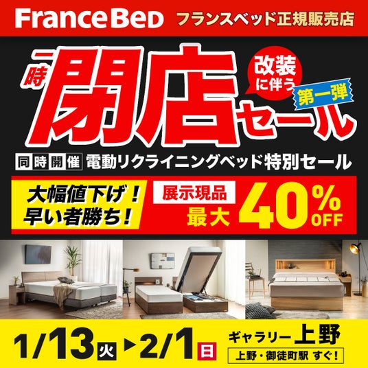 【店内最大40%OFF】1/13(火)~2/1(日)限定/ベッド&家具『一時閉店セール』開催@上野!ー ビッグイベントでお買い得。エリア最大級*展示。