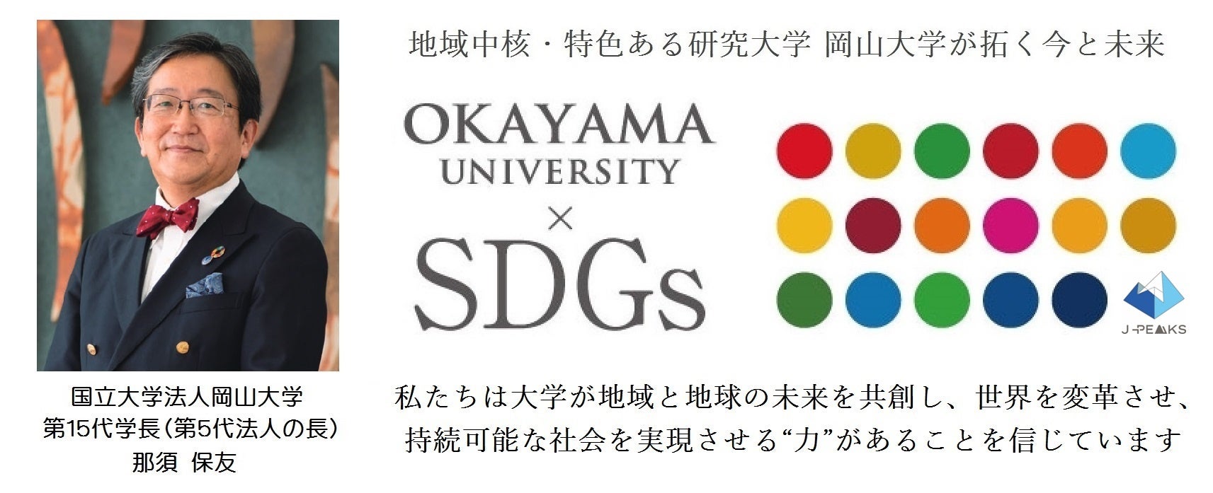 - 岡山大学 文部科学省「地域中核・特色ある研究大学強化促進事業(J-PEAKS)」に採択~地域と地球の未来を共創し、世界の革新の中核となる研究大学:岡山大学の実現を加速とともに世界に誇れる我が国の研究大学の山脈を築く~