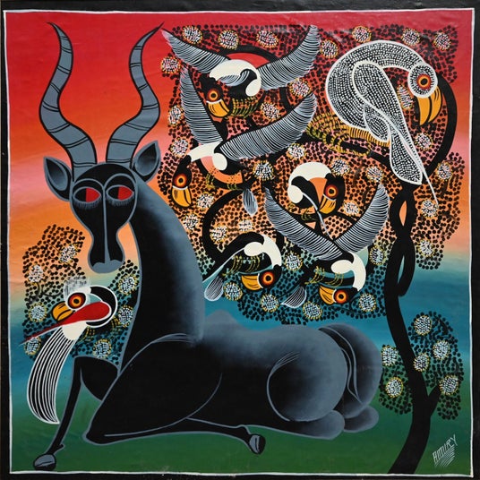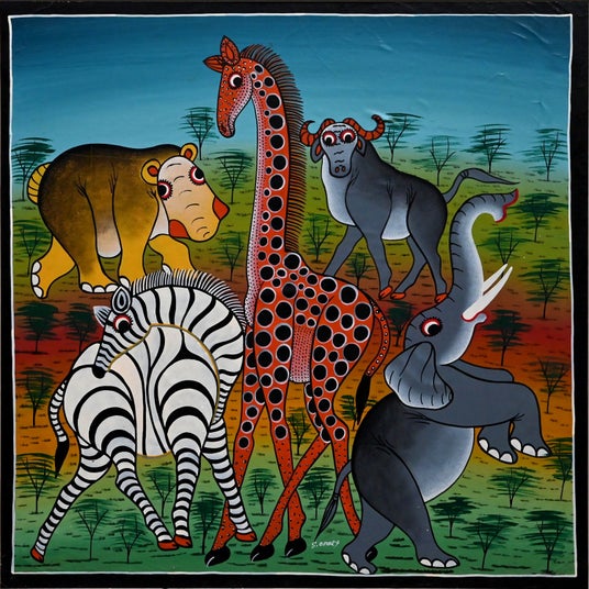 サバンナを駆ける動物たちを色鮮やかに描いたティンガティンガ絵画を紹介します