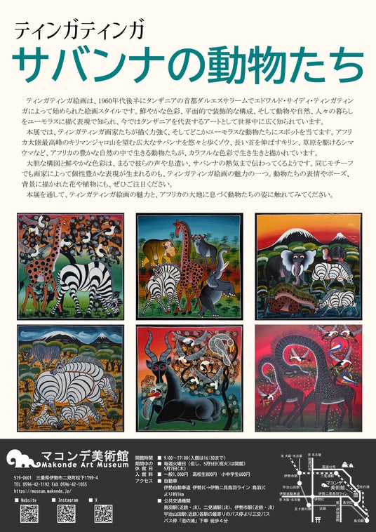 本展を通して、ティンガティンガ絵画の魅力と、アフリカの大地に息づく動物たちの姿に触れてみてください。