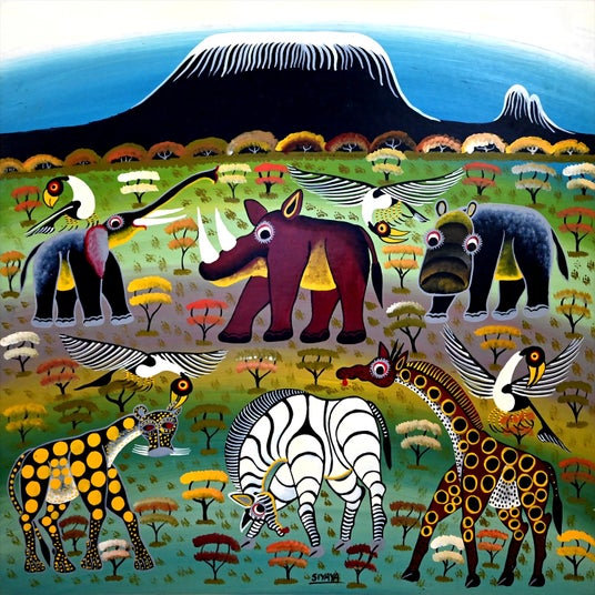 ティンガティンガ絵画は、1960年代後半にタンザニアの首都ダルエスサラームでエドワルド・サイディ・ティンガティンガによって始められた絵画スタイルです。鮮やかな色彩、平面的で装飾的な構成、そして動物や自然、人々の暮らしをユーモラスに描く表現で知られ、今ではタンザニアを代表するアートとして世界中に広く知られています。