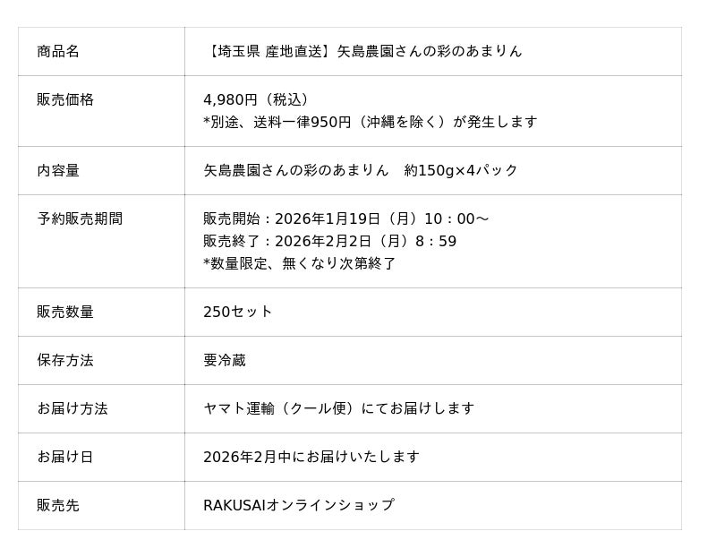 d130004-122-1f535fda291f53bc0e671122fd8338ae.pdf 楽彩株式会社(本社:東京都足立区、代表取締役社長:大崎善保)は、昨年販売し大好評のいちご『矢島農園さんの彩のあまりん』を、2026年1月19日(月)より予約販売いたします。埼玉県が誇るブランド品種「あまりん」。矢島農園の育むいちごはその圧倒的な糖度と濃厚な味わいで、多くのファンを魅了しています。昨年即完売となったその贅沢な美味しさを、今年も最高の状態でお客様の元へお届けいたします。
