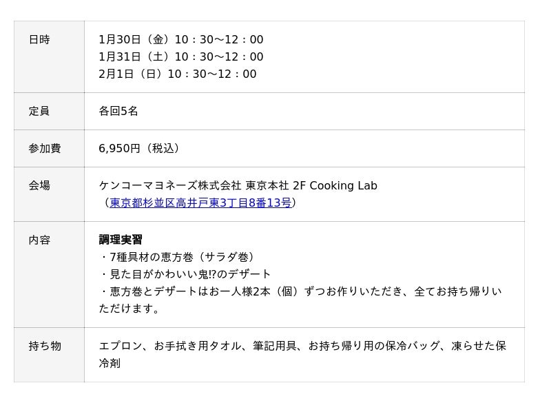 ケンコーマヨネーズの料理教室「キッチンスペース831」にて、恵方巻2本とかわいい鬼のデザートが作れるレッスンの募集を開始しました。節分やハレの日にもぴったりです。