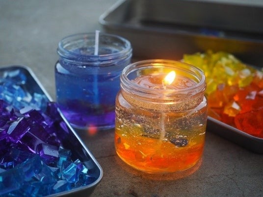 透明なジェルワックスのキャンドルを作ります。菜の花や桜の花の形のガラスパーツを選んでジェルの中に閉じ込めます。開催日時:3月7日(土)10:00~12:00、13:00~15:00