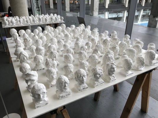 紙粘土で顔彫刻を作ると、「あれ?こんな顔だったんだ!」と新しい発見があるよ!作った作品は一週間展示して、みんなに見てもらおう!