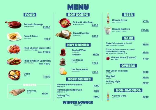 スケートの合間や楽しんだ後、こたつに入りながら食べるのにぴったりな冬メニューのほか、コロナ エキストラやコロナ セロの販売も行います。
