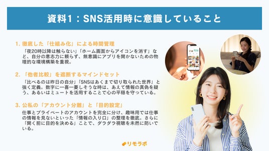 また、SNS疲れを未然に防ぎ、SNSを武器として使い続けるために意識していることについては、以下のような回答が見られました(資料1)。