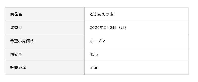 のりやごま、ふりかけ、お茶漬けの素などの製造、販売を行う、株式会社浜乙女(本社:名古屋市中村区、代表取締役社長:服部義博)は、手軽に野菜のおかずを楽しめる「ごまあえの素」を、2026年2月2日(月)より全国で発売いたします。忙しい現代人の「副菜を作る時間がない」でも「栄養のあるものも食べたい」というユーザー様のニーズに応えるべく、健康的な一品の調理をサポートし、老若男女を問わず親しまれる、食べやすく甘辛い味わいに仕上げております。