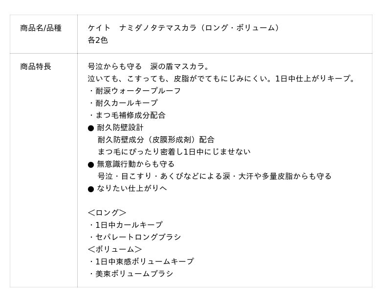 号泣したりしても美しさを守り抜くマスカラとアイライナーを、日本をはじめとするアジア各国と地域でも発売し、「KATE」が提唱する"陰影メイク"のさらなる強化を図り、グローバルメイクブランドとしての成長を加速させていきます。