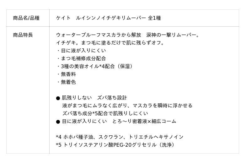 さらに、こすらずに浮かせるウォータープルーフマスカラ対応のリムーバー『ケイト ルイシンノイチゲキリムーバー』も発売します。