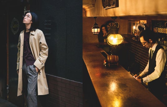 昭和の名だたる文豪たちが集った銀座のバー「ルパン」では、オーセンティックな雰囲気に合わせ、英国王室御用達のジョンスメドレーのニットを着用。大人の社交の場にふさわしい装いで、特別な時間を過ごします。