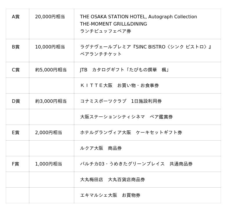 対象期間中に大阪ステーションシティ内の店舗で発行された1,000円(税込)以上のレシート1枚で参加可能なお楽しみ抽選会で、大阪ステーションシティ内で利用できる最大2万円相当の豪華商品券やお食事券等が当たります。春のおでかけにぜひご参加ください♪