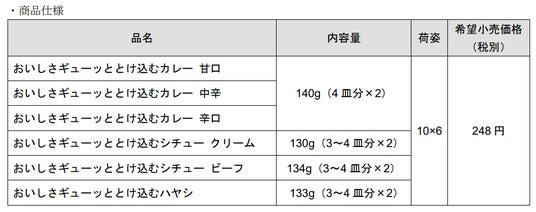 ギューッととけ込む」シリーズより、「ハヤシ」を新発売し、「カレー 甘口」「カレー 中辛」「カレー 辛口」「シチュー クリーム」「シチュー ビーフ」をリフレッシュします。