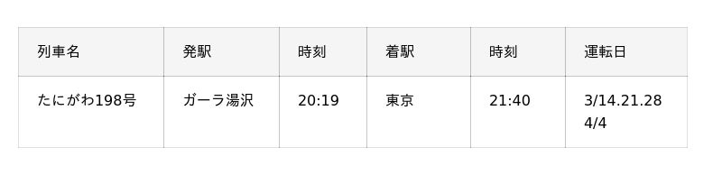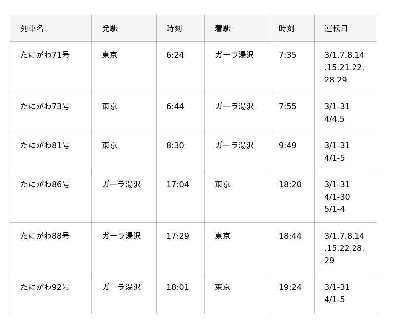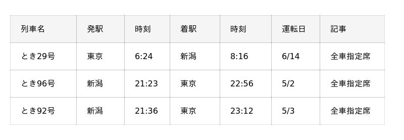 ◆GALA湯沢スキー場直通の主な臨時列車は以下の通りです。